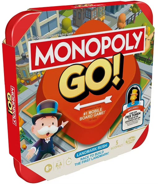 And in a success story like Monopoly, you can end up lapping yourself: in a meta “IP will eat itself” moment that I love, MONOPOLY GO! now has a physical board game edition.