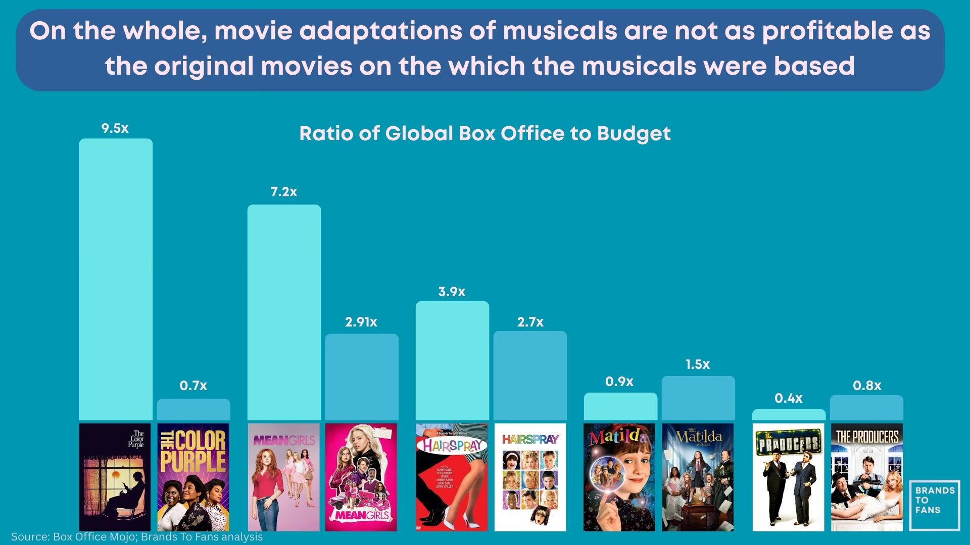 The cautionary tales within this micro-category are 2005’s The Producers ($38m on a $45m budget) and 2023’s The Color Purple ($69m on a $95m budget). But a failed movie adaptation does not seem to dent the prospects of its original stage version - The Producers is returning to the West End this Autumn.