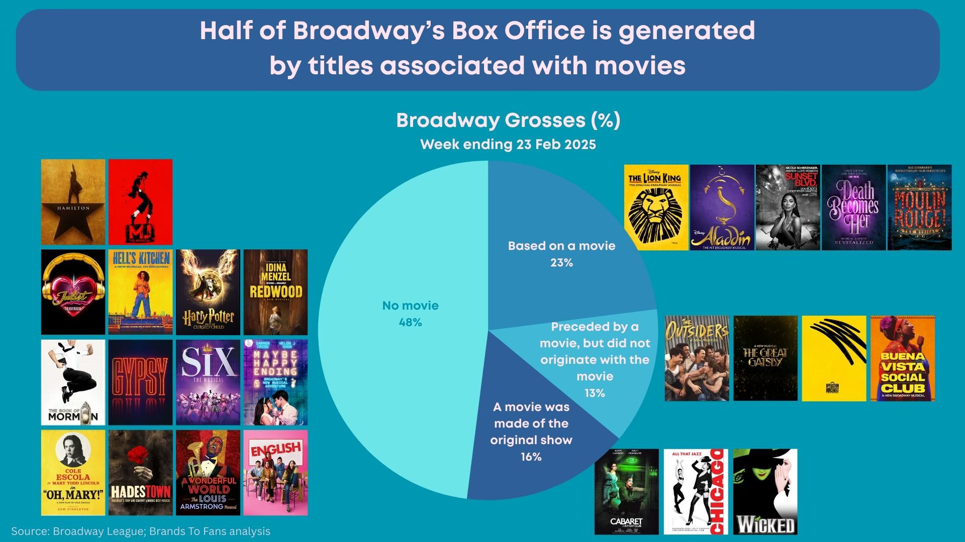 Meanwhile, more than half of Broadway grosses are generated by shows associated with movies (they are either based on a movie; preceded by a movie although not directly based on it; or have had a movie based on the show).